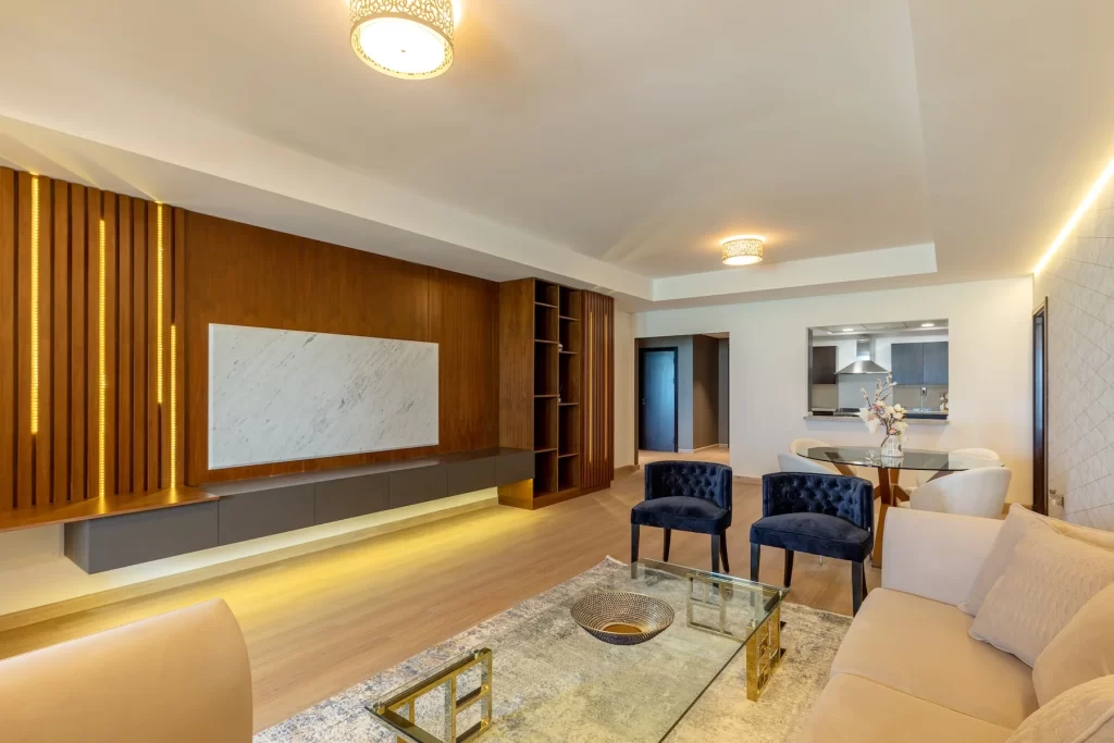 Designed for a Saudi client to host his VIP guests in comfort and style, this apartment blends modern elegance with a warm, welcoming atmosphere. The living spaces feature rich wood accents, soft ambient lighting, and plush seating, creating an inviting setting for relaxation or conversation. The bedroom offers a serene retreat with layered textures, bespoke wall art, and calming tones, ensuring guests feel at home while enjoying a luxurious stay.