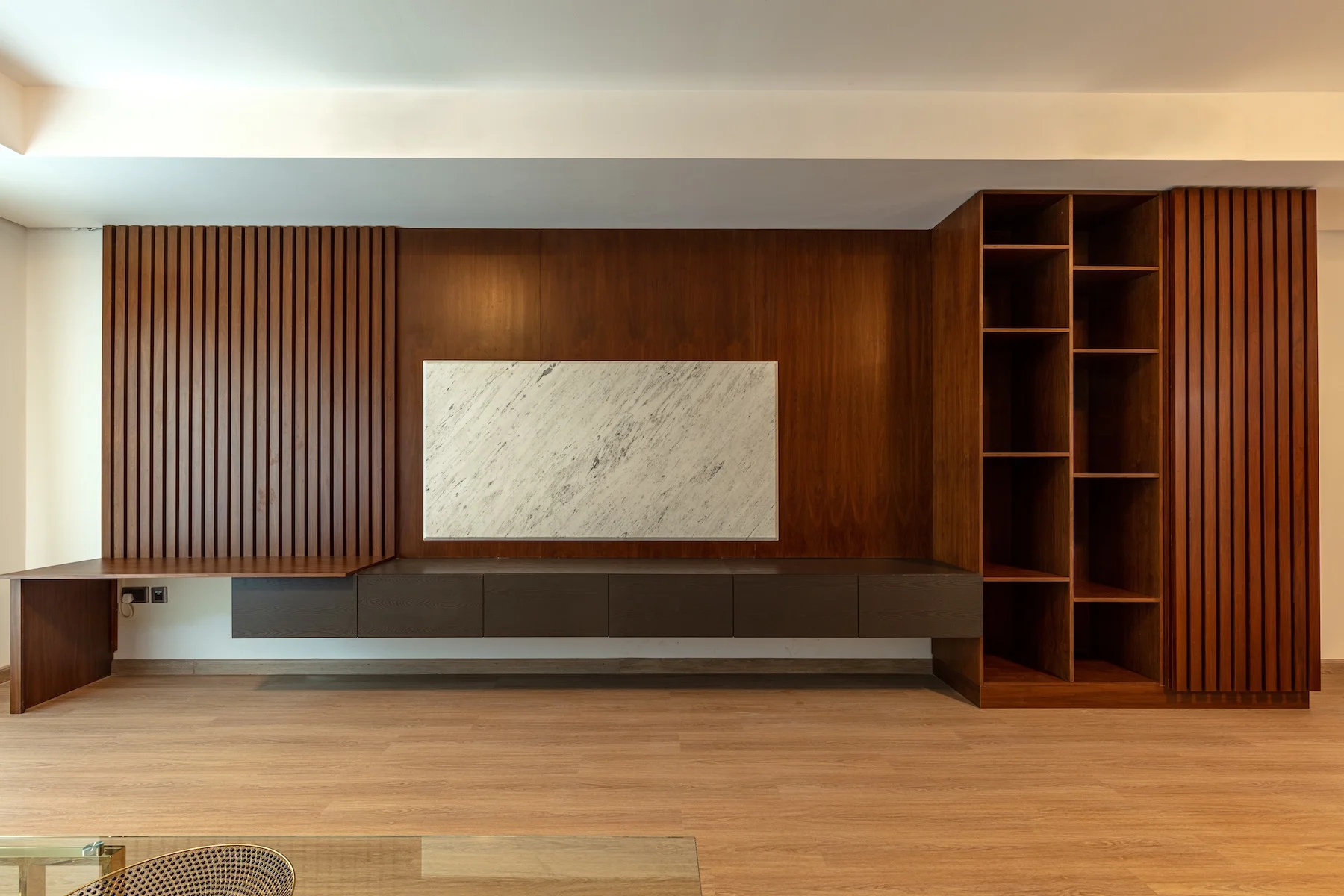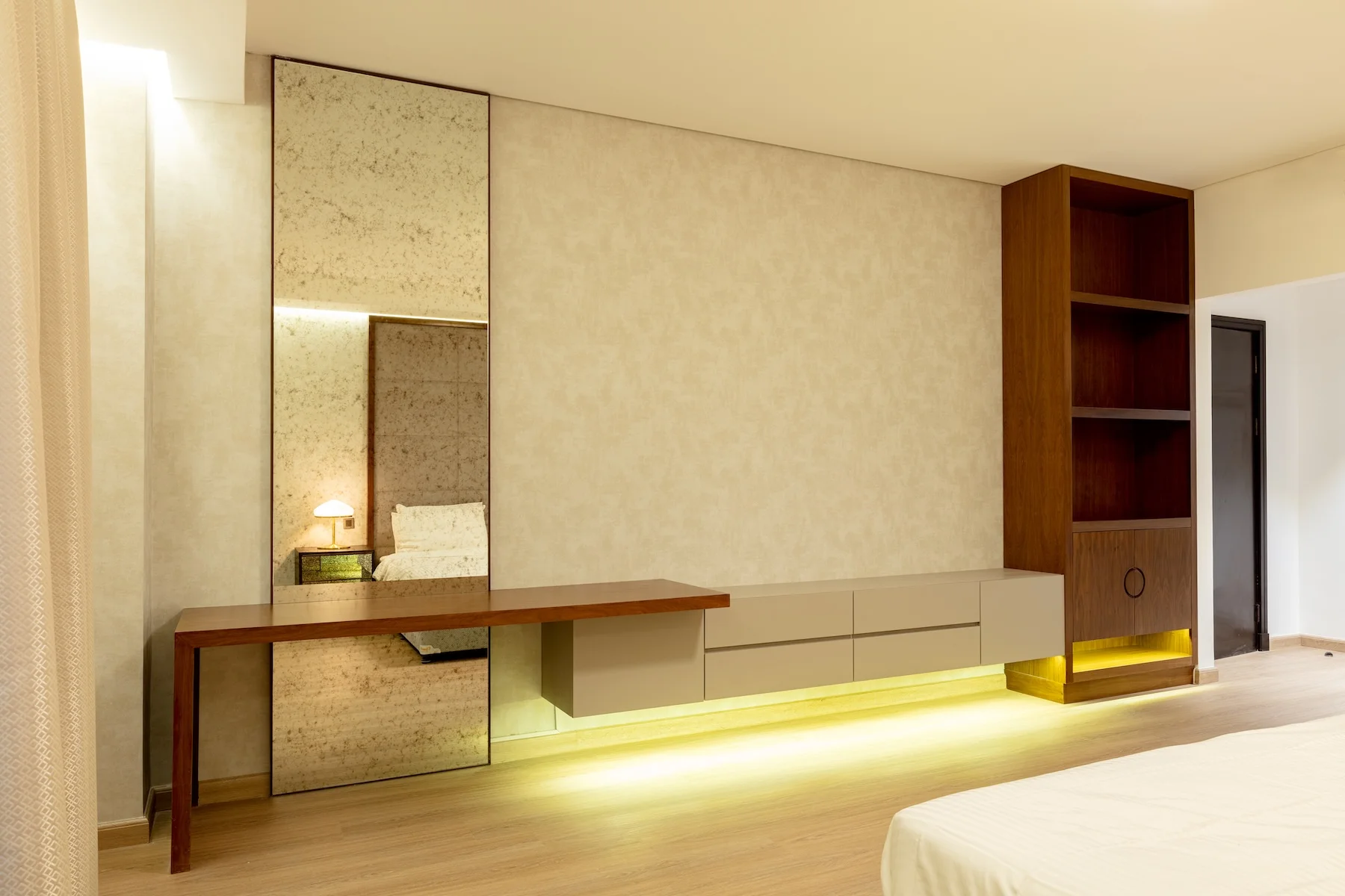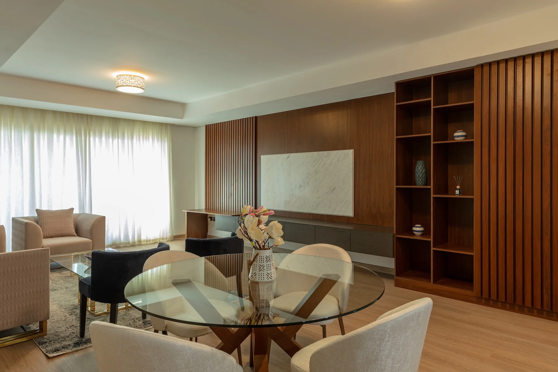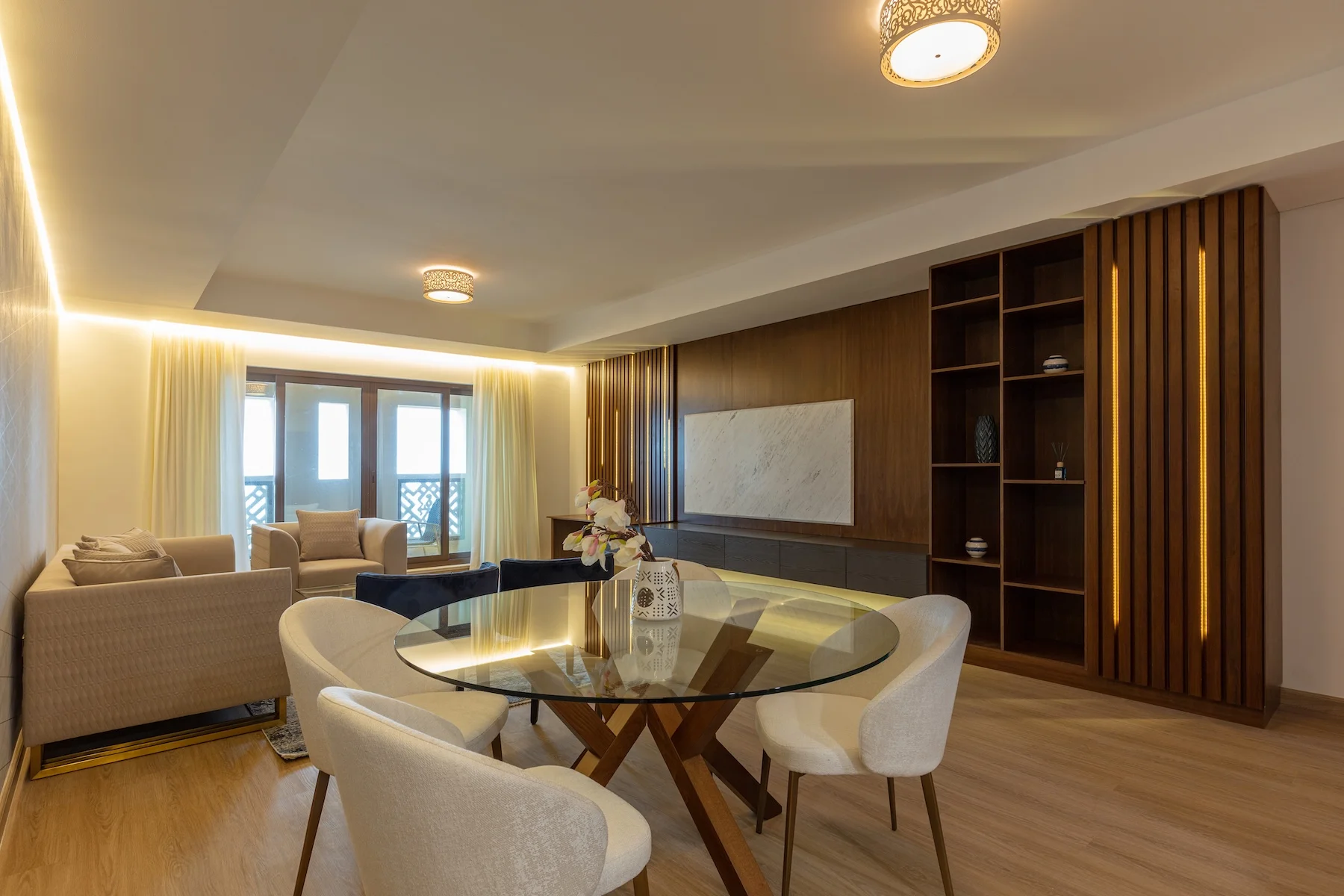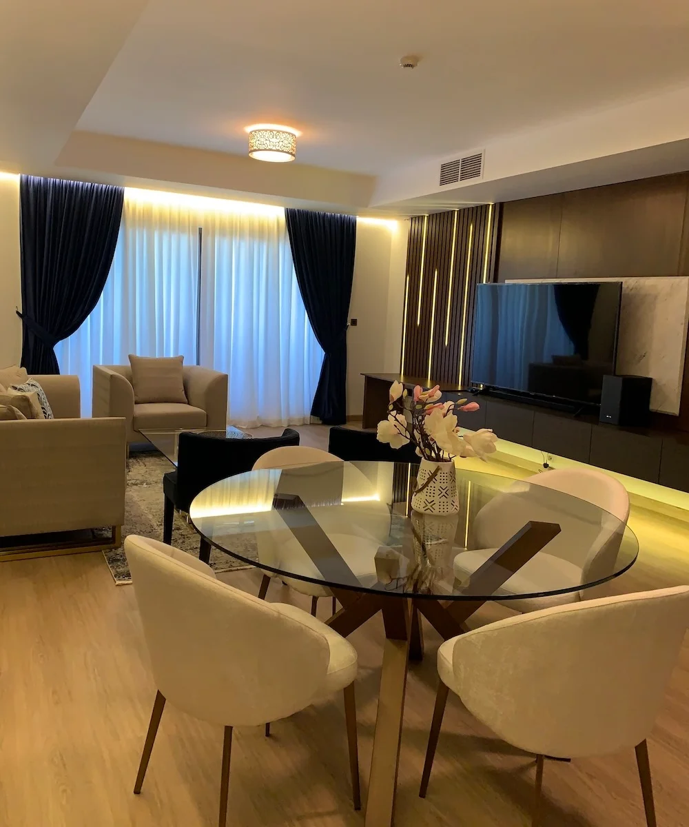 Designed for a Saudi client to host his VIP guests in comfort and style, this apartment blends modern elegance with a warm, welcoming atmosphere. The living spaces feature rich wood accents, soft ambient lighting, and plush seating, creating an inviting setting for relaxation or conversation. The bedroom offers a serene retreat with layered textures, bespoke wall art, and calming tones, ensuring guests feel at home while enjoying a luxurious stay.