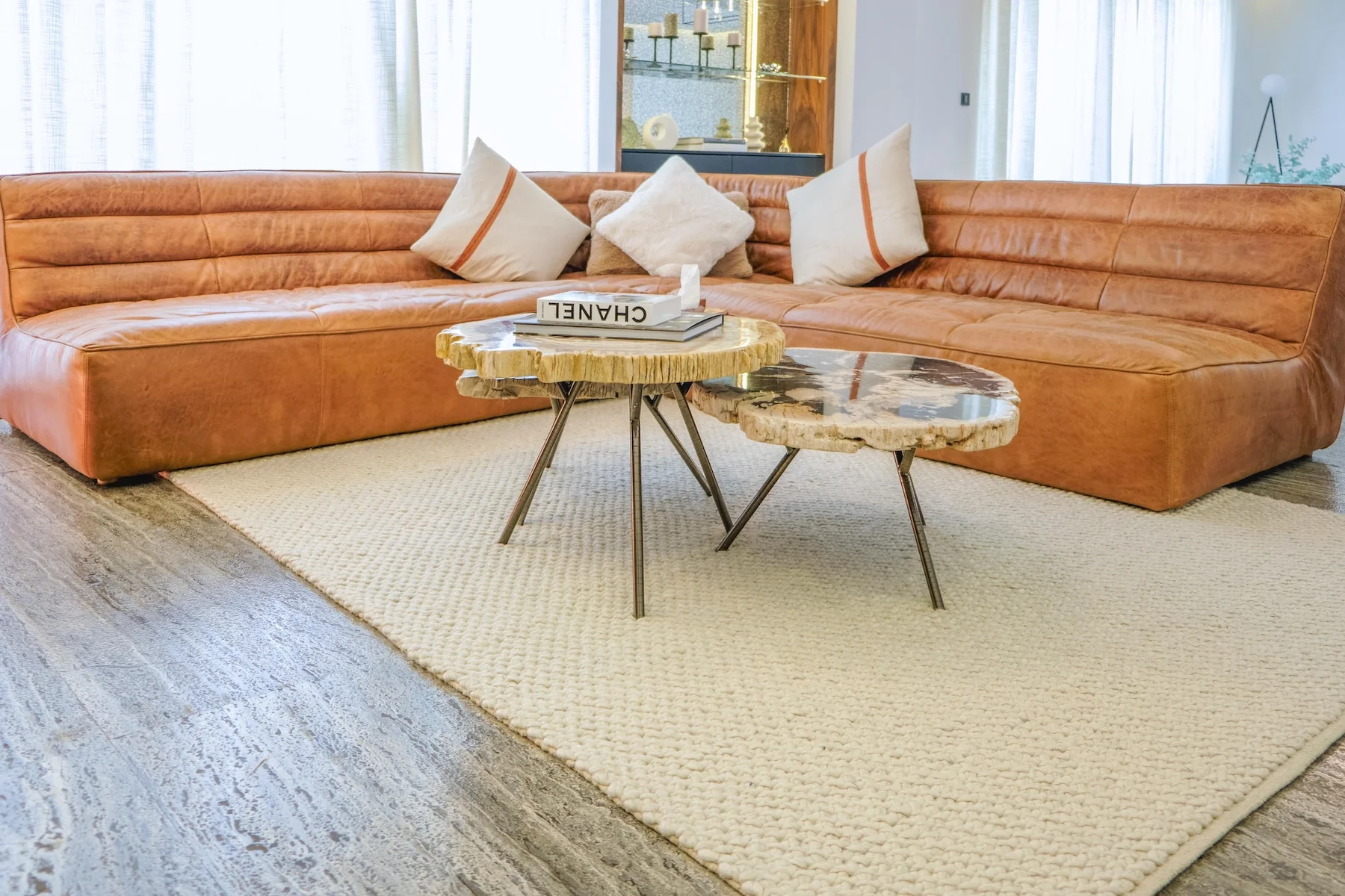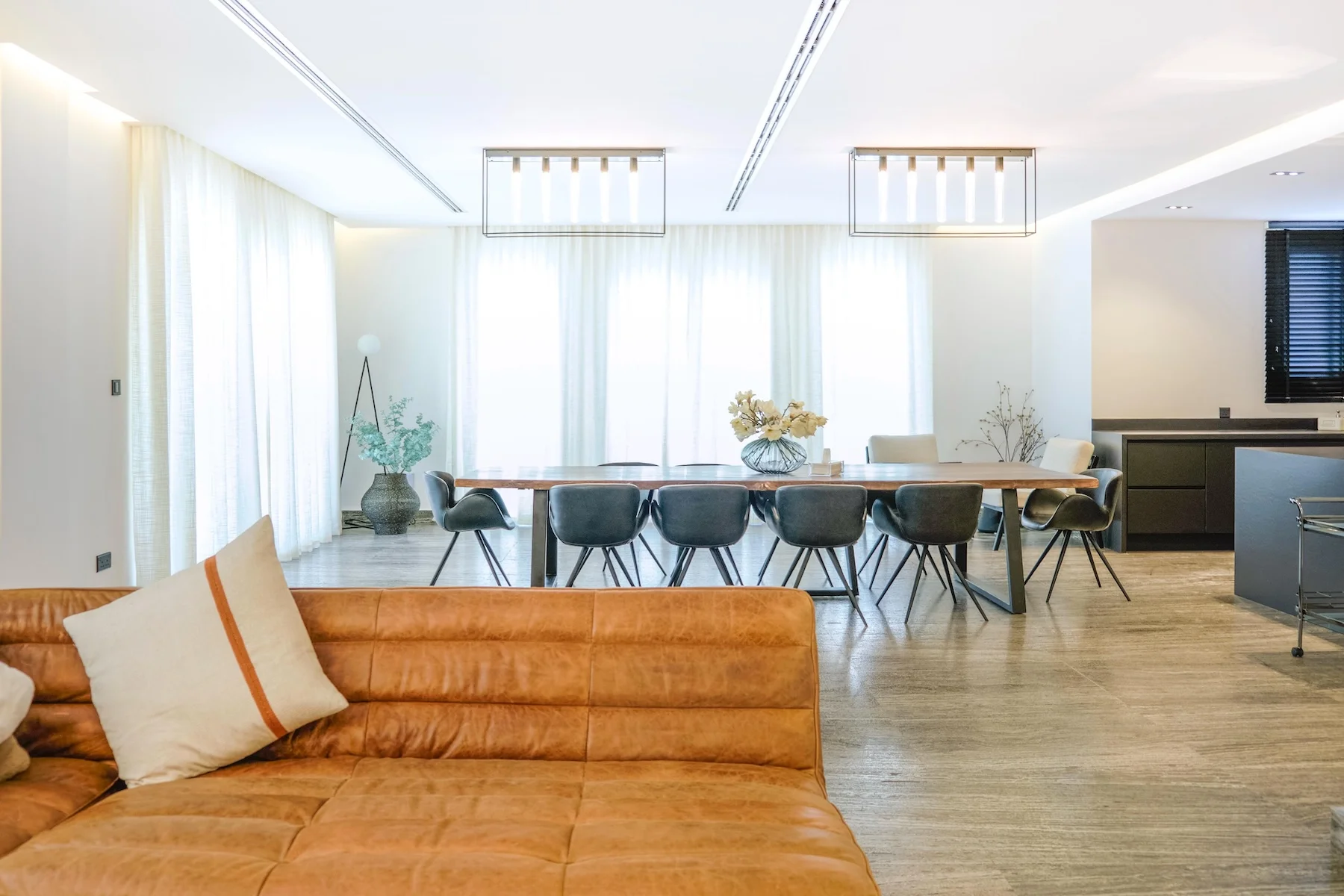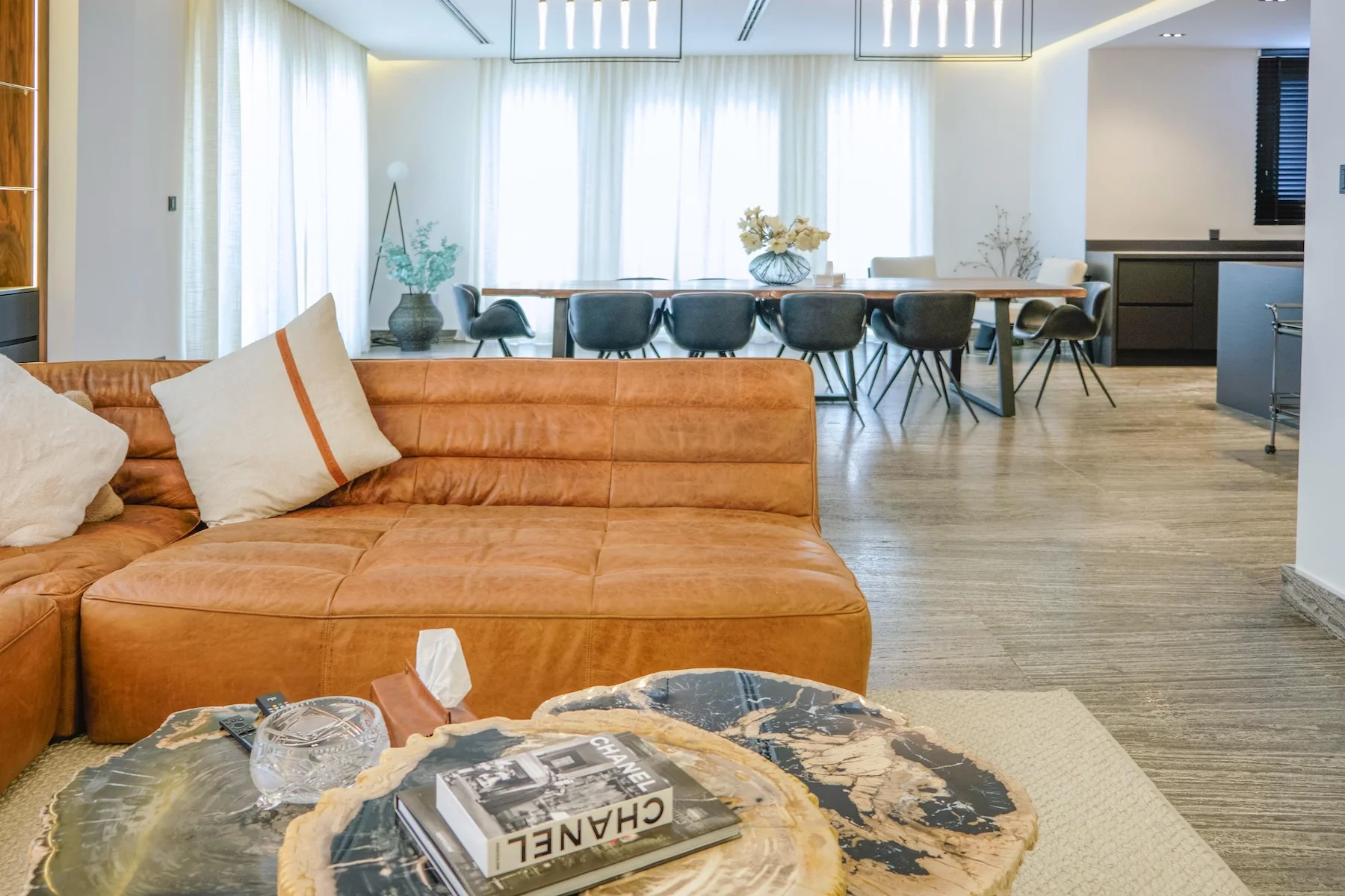 This project showcases a seamless blend of luxury and comfort with warm leather seating, a custom dining area, and a sleek open-plan kitchen. Natural textures, earthy tones, and contemporary finishes bring elegance to every detail—from the statement chandelier to the modern bathroom design. A perfect balance of functionality and style, this home reflects refined Dubai living.