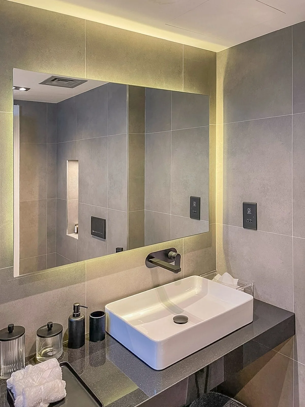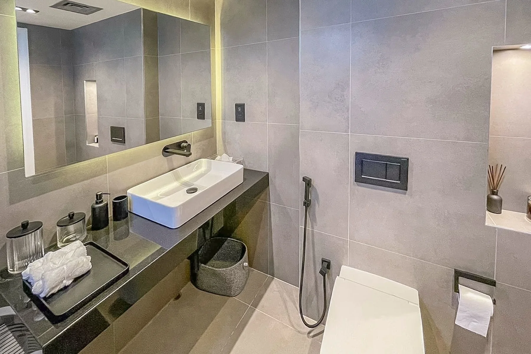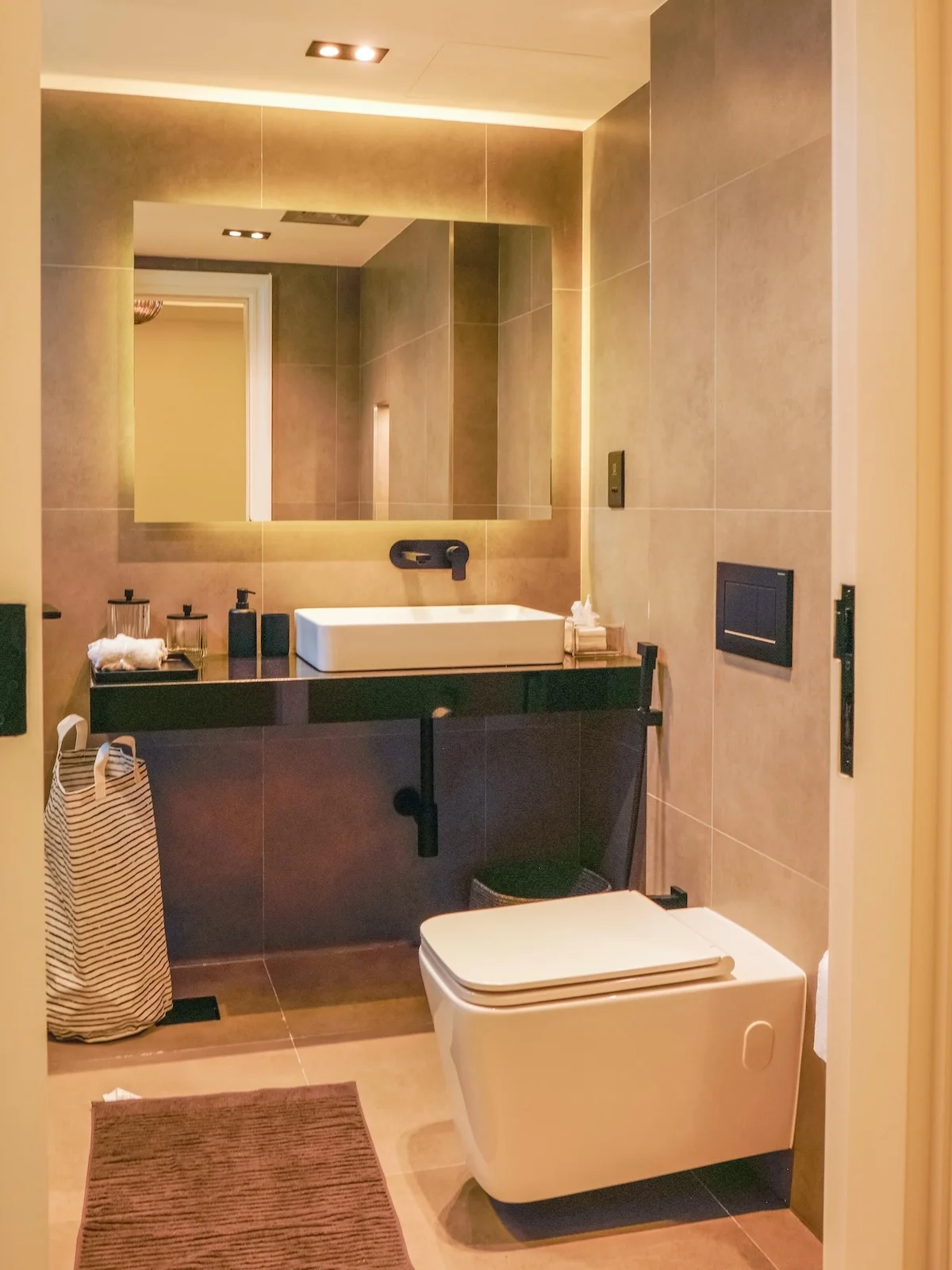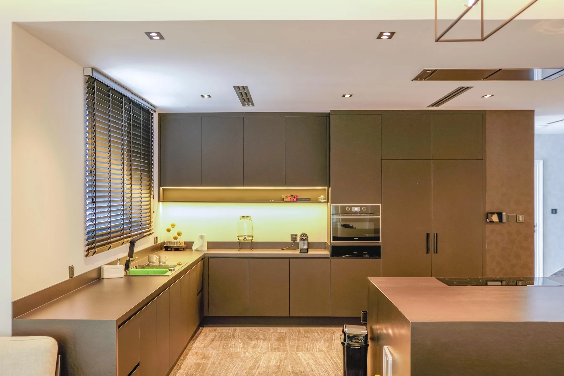 This project showcases a seamless blend of luxury and comfort with warm leather seating, a custom dining area, and a sleek open-plan kitchen. Natural textures, earthy tones, and contemporary finishes bring elegance to every detail—from the statement chandelier to the modern bathroom design. A perfect balance of functionality and style, this home reflects refined Dubai living.